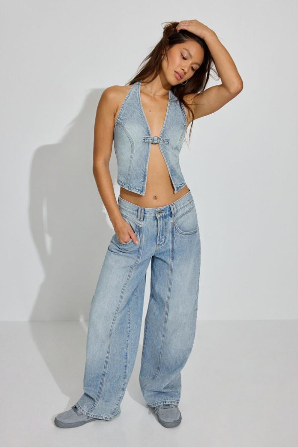 Elevate your style with this chic denim halter top, perfectly paired with matching jeans for a complete western-inspired look.